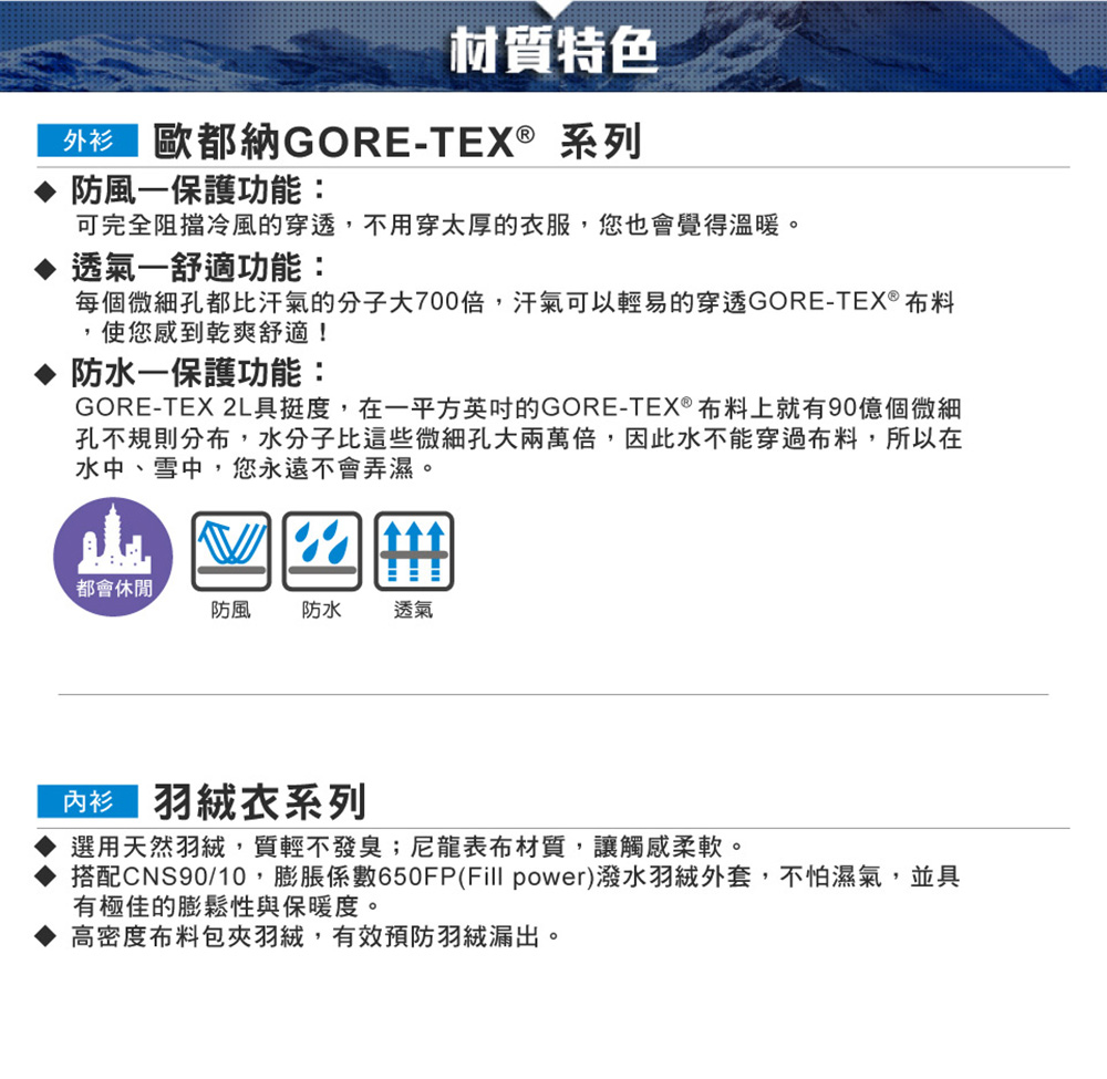 GORE-TEX 2L 材質,提供完全防風、防水、透氣等機能