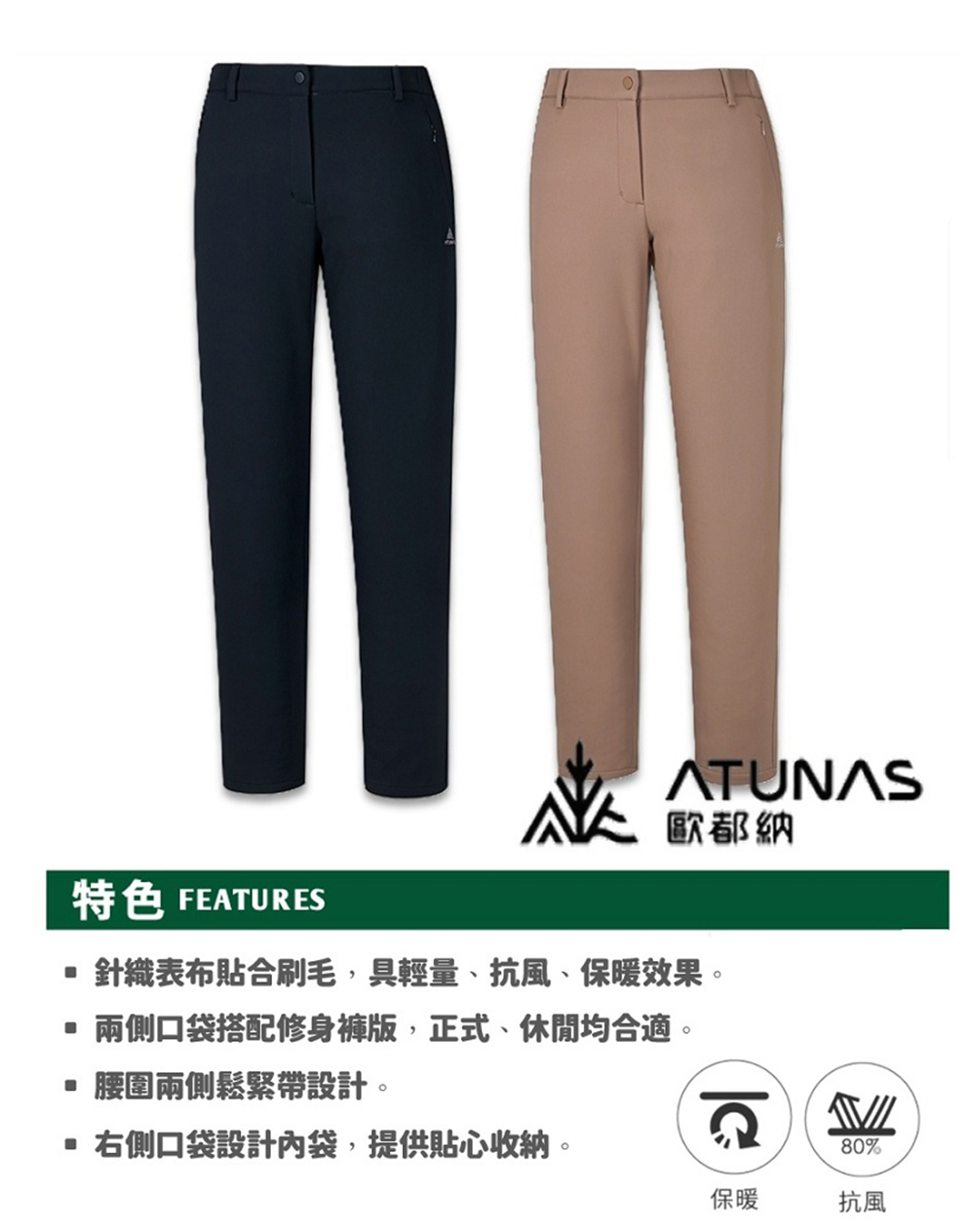(女)【歐都納ATUNAS】抗風保暖長褲 -黑 A6PA2532WB