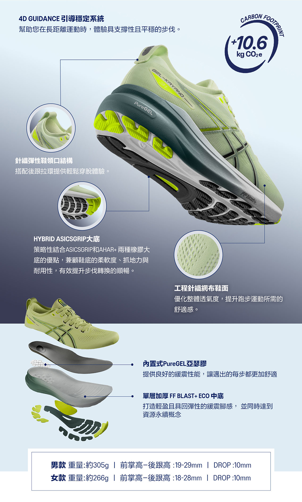 中底結構採用4D GUIDANCE引導穩定系統,利用四向維度(長度、寬度、深度、時間-足弓回正速度)幫助您在長距離運動時,體驗具支撐及平衡的步伐。