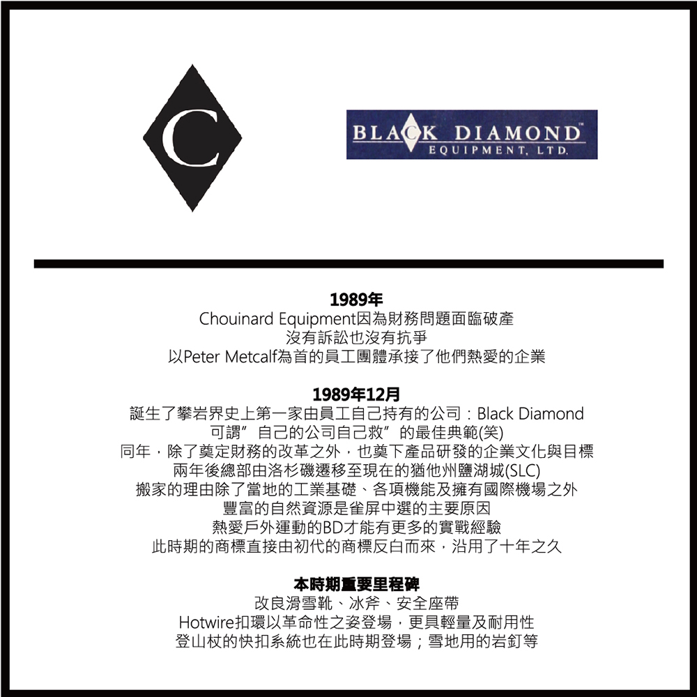 從一間在車庫創立、生產的小工廠,到目前為一個遍及三大洲的國際領導品牌, Black Diamond不僅僅專為登山、攀岩、滑雪和越野跑等愛好者服務,更代表了對於大自然的情感、運動及自我挑戰的精神,無論是過去、現在甚至到未來,Black Diamond始終堅持對目標與價值的追尋。