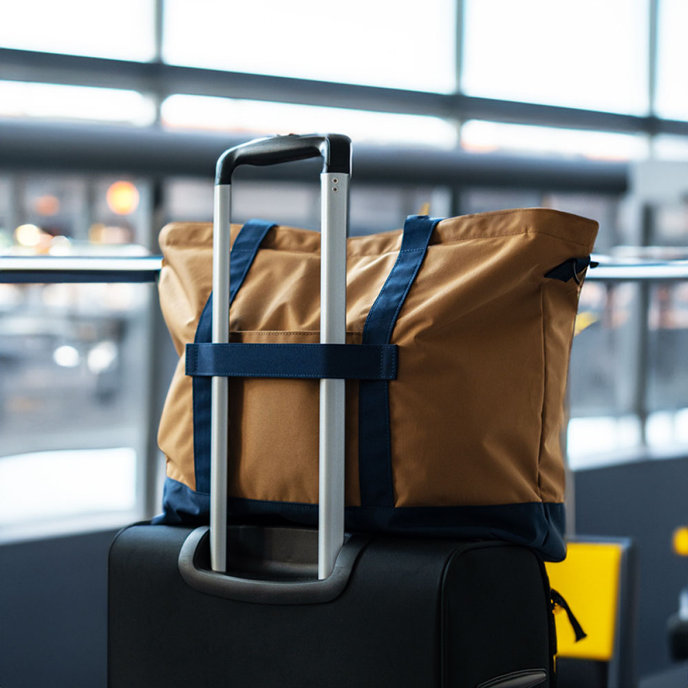 它配有一條帶子,可以輕鬆放置在手提箱頂部。