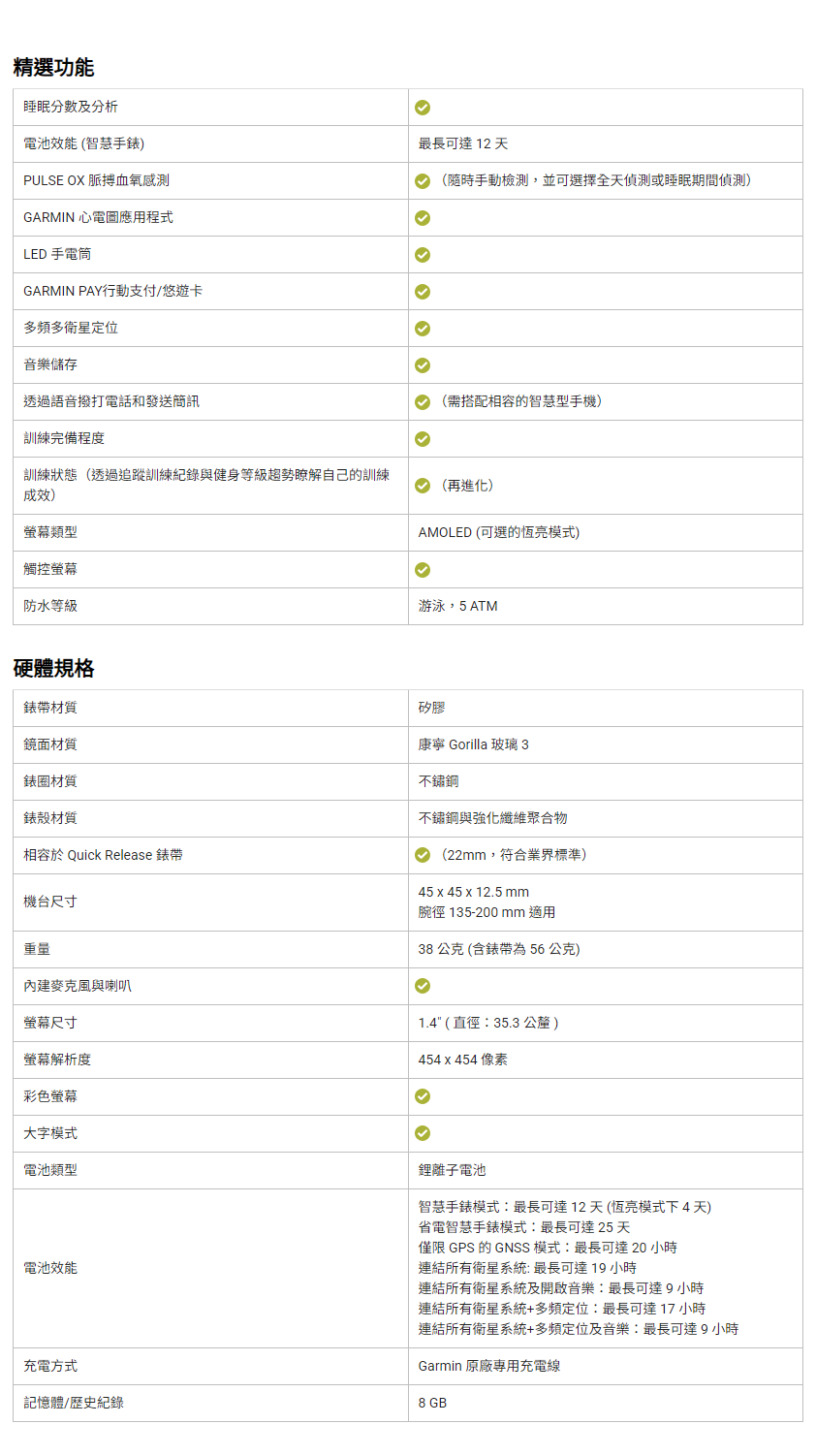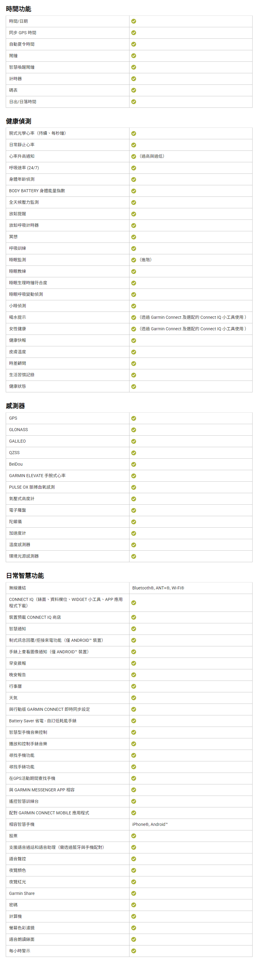 包括 Body Battery 身體能量指數、 壓力監測、 脈搏血氧感測