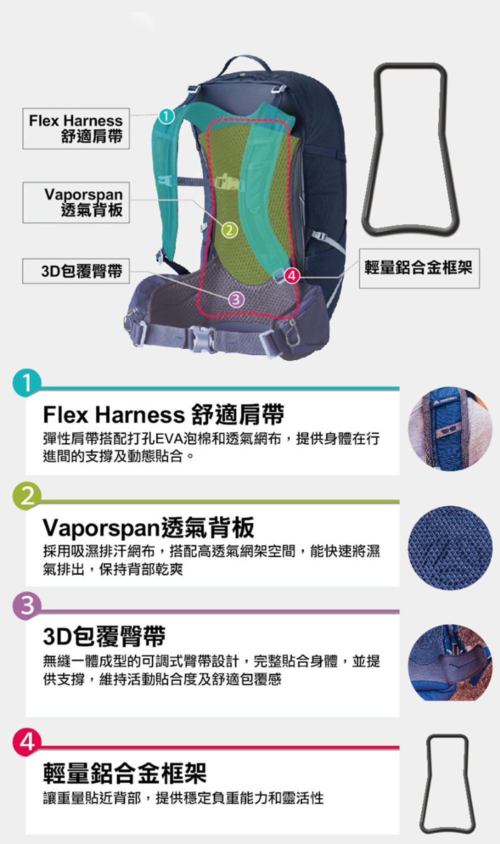 採用VaporSpan Backpanel高透氣網架背板結合3D包覆臀帶及Flex Harness透氣打孔肩帶,提供身體在行進間的動態支撐及舒適性。
