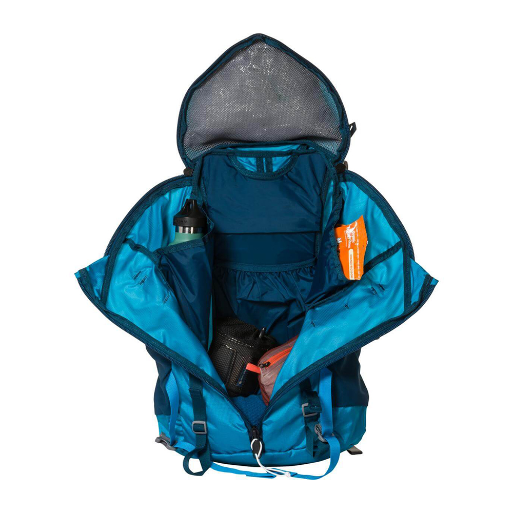 32L的容量,可以進行單日健行、裝備精簡或是不需背負公糧的過夜行程。3-ZIP三向拉鍊設計,讓打包與拿取物品更便利、背包內層可放置水袋、兩側有彈性口袋可放置水壺、頂袋與腰帶也有拉鍊口袋能放置隨身小物。