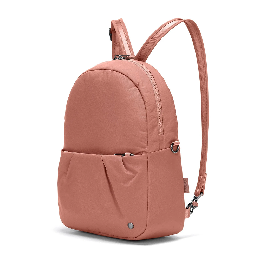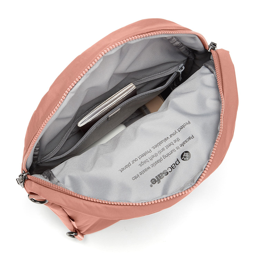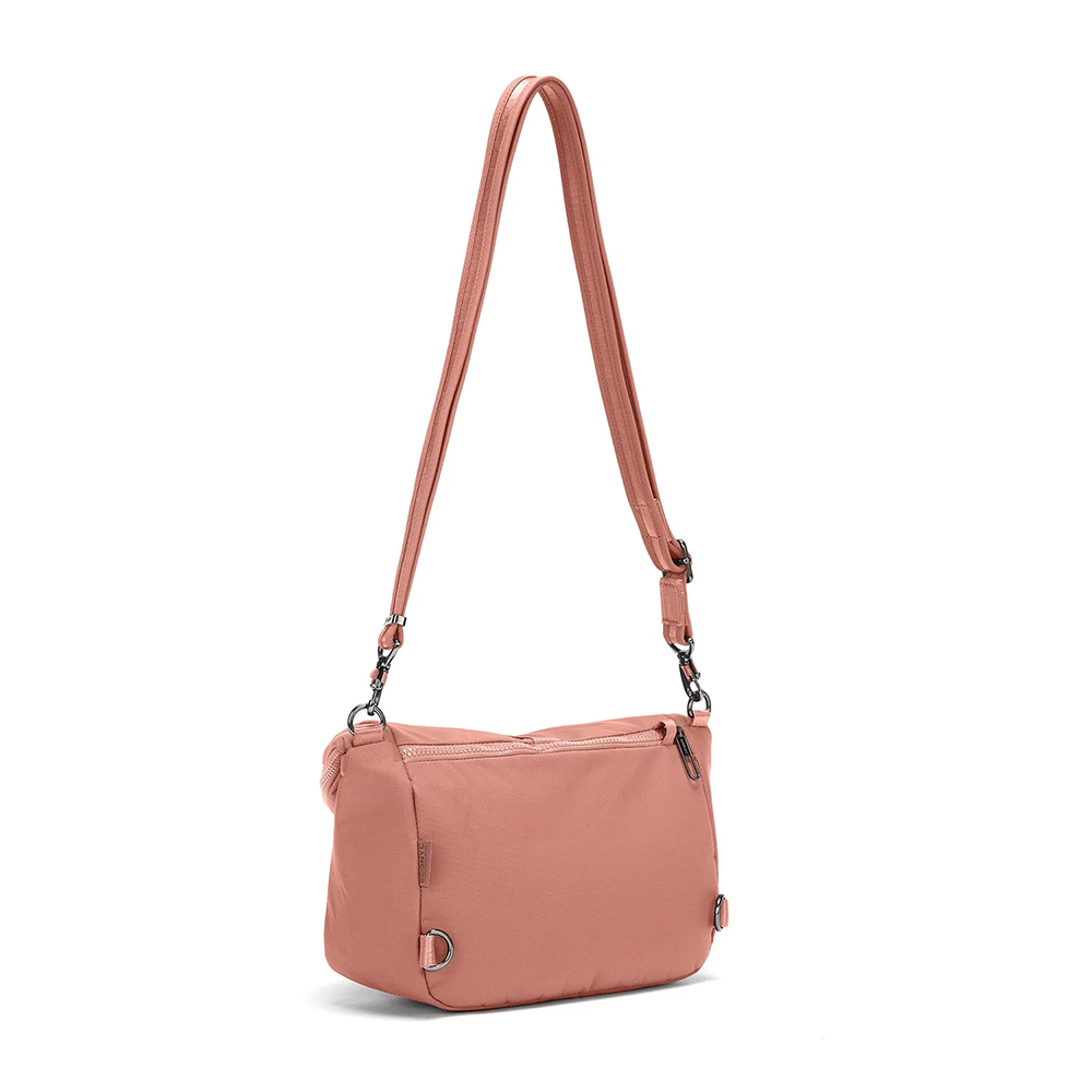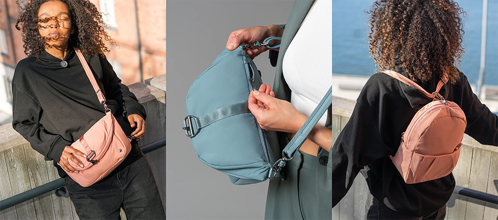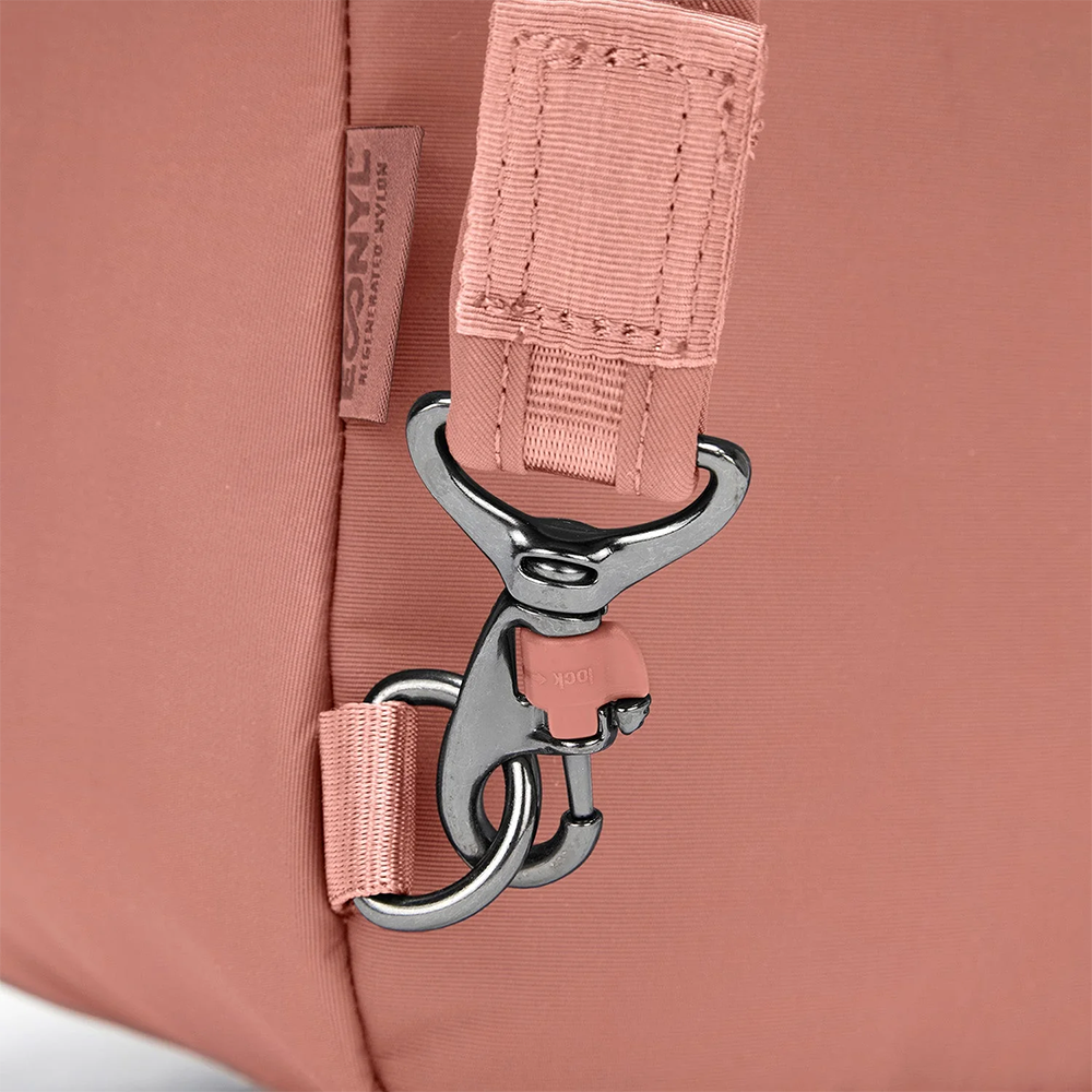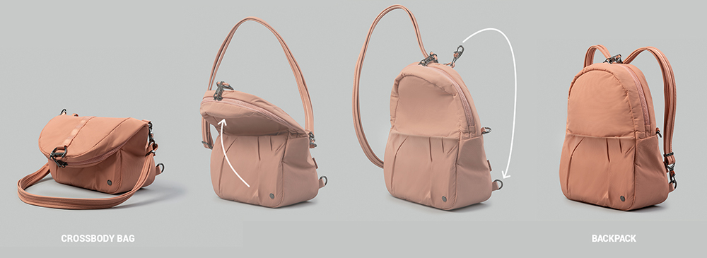 兩個時尚防盜袋合而為一 - 可轉換設計可作為背包攜帶,也可折疊成手提包。可容納錢包、化妝包等物品,並具有防盜安全功能,可保護您的貴重物品。採用 ECONYL® 再生尼龍製成。