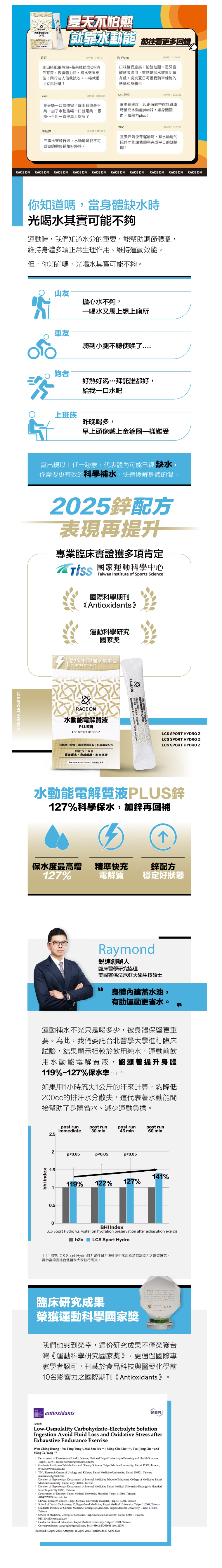 A:在運動中,身體水份散失超過體重的2%時就會直接影響運動,超過6%時則會有休克、橫紋肌溶解和死亡風險。水動能主要效果之一在於提升保水能力,根據臨床試驗結果,相較於水,水動能有效提升身體保水率約120%,並降低水份散失來保持運動效能和安全性。另外,電解質為維持肌肉收縮及調節身體功能的重要角色,且依照美國大學運動醫學會(ACSM)建議,長時間運動者每小時應補充300-600毫克的鈉,以維持肌肉正常收縮力量,以維持運動品質及表現。