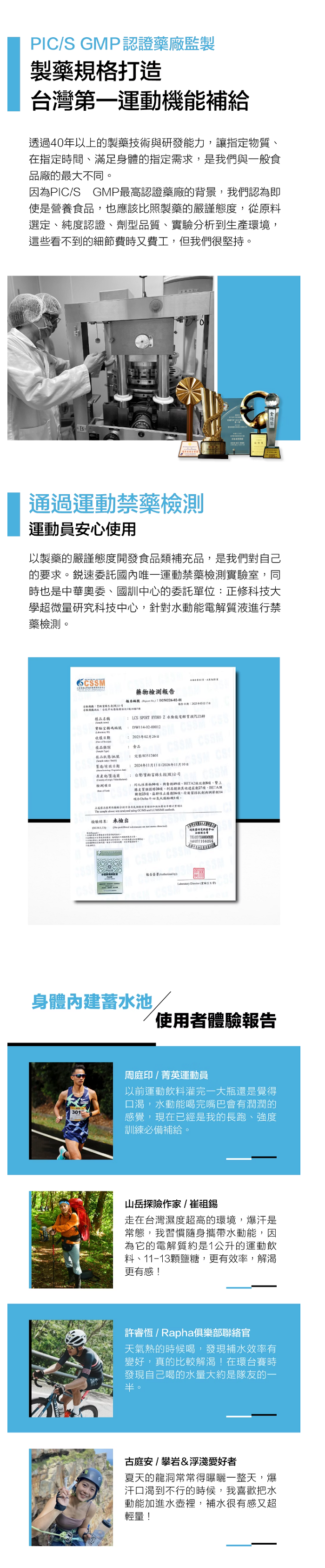 - 本產品並非設計為一般日常飲料,建議於長時間或大量流汗的運動期間飲用
