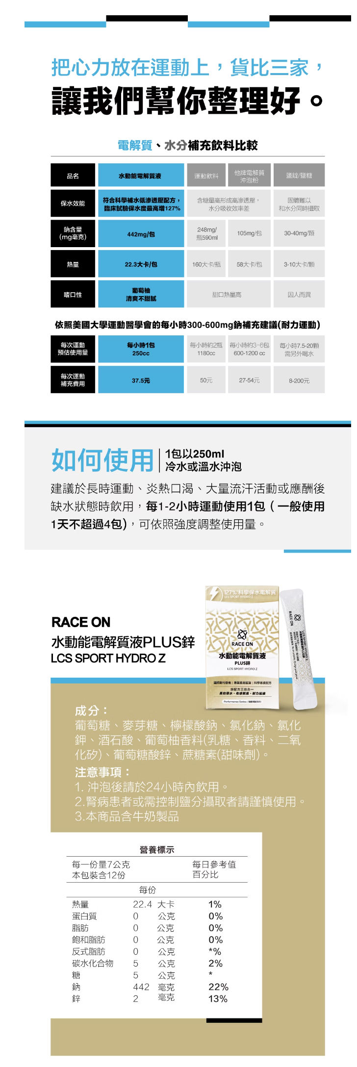 【Race On 銳速】水動能電解質液PLUS鋅(2025升級版) 保水補水 高單位電解質 葡萄糖吸收快 低熱量 輕量化登山 補鋅電解質 12包/盒(奶蛋蔬食可 )