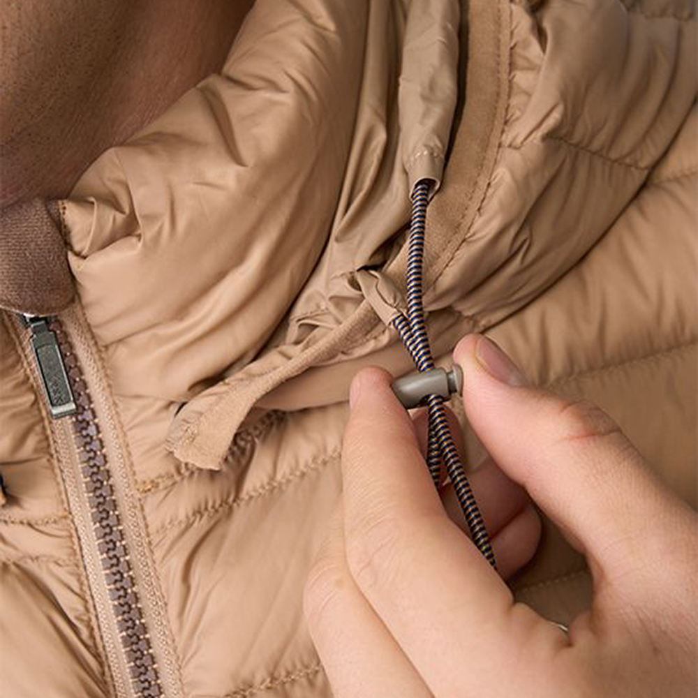 產品特性 可拆帽、帽前緣對折帶保暖包覆性佳加內側鬆緊丸繩可調節、顯瘦寬度壓隔.腰身剪接線條、