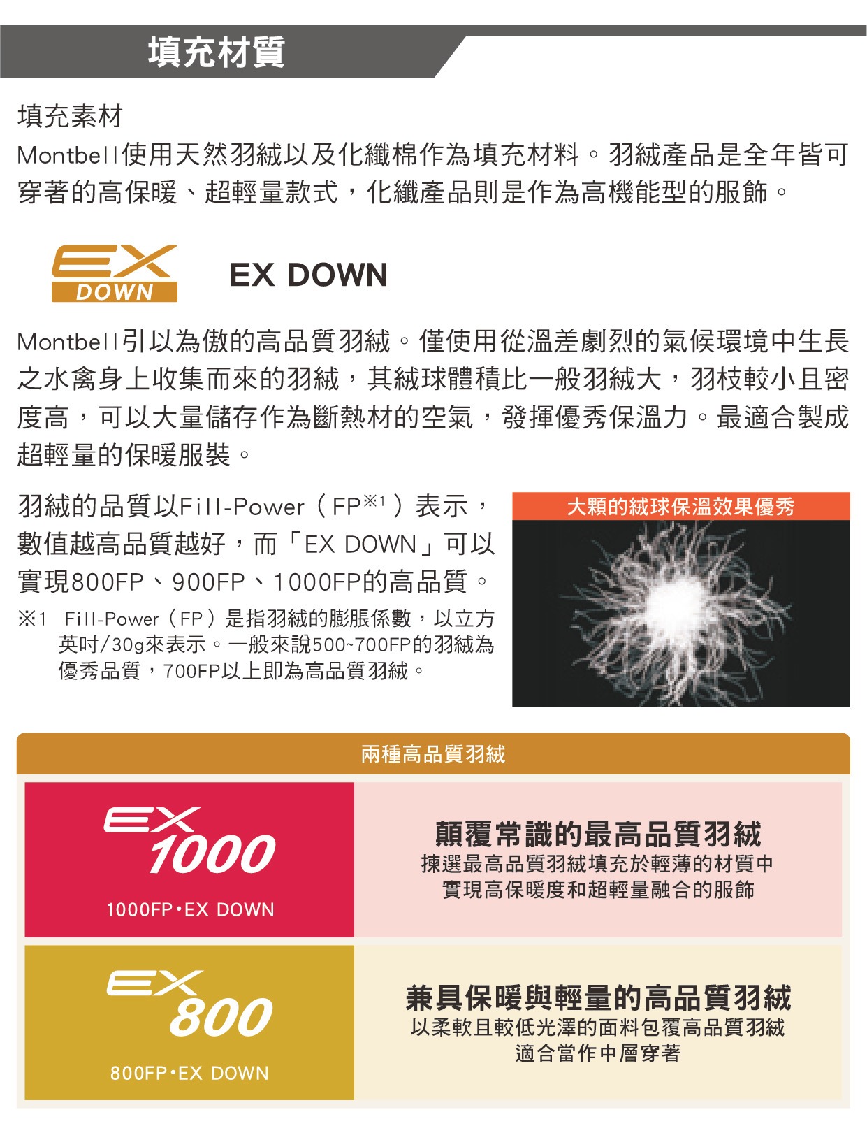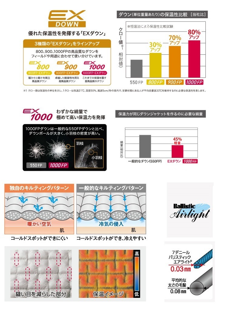 保暖增幅 80%:1000FP EX Down 的保暖性能比一般 550FP 羽絨高出 80%。