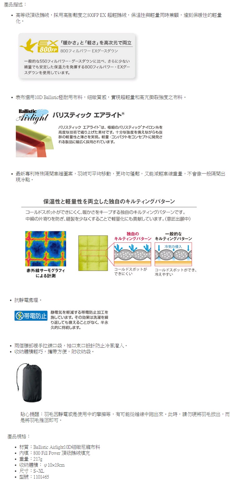 高等級頂級鵝絨,採用高膨鬆度之800 fill power 羽絨達到保暖性的輕量化。