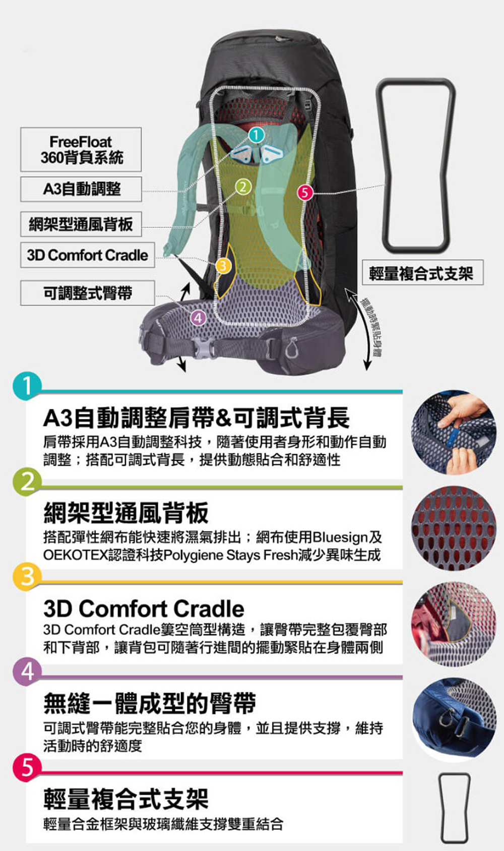 一體成型FreeFloat臀帶,搭配特有的肩帶自動調節板,可隨著使用者身形及活動改變肩帶的角度,達到優異的舒適度及身體包覆感,提供無壓力動態支撐,可保持背包支撐性,在活動時更省力舒適。