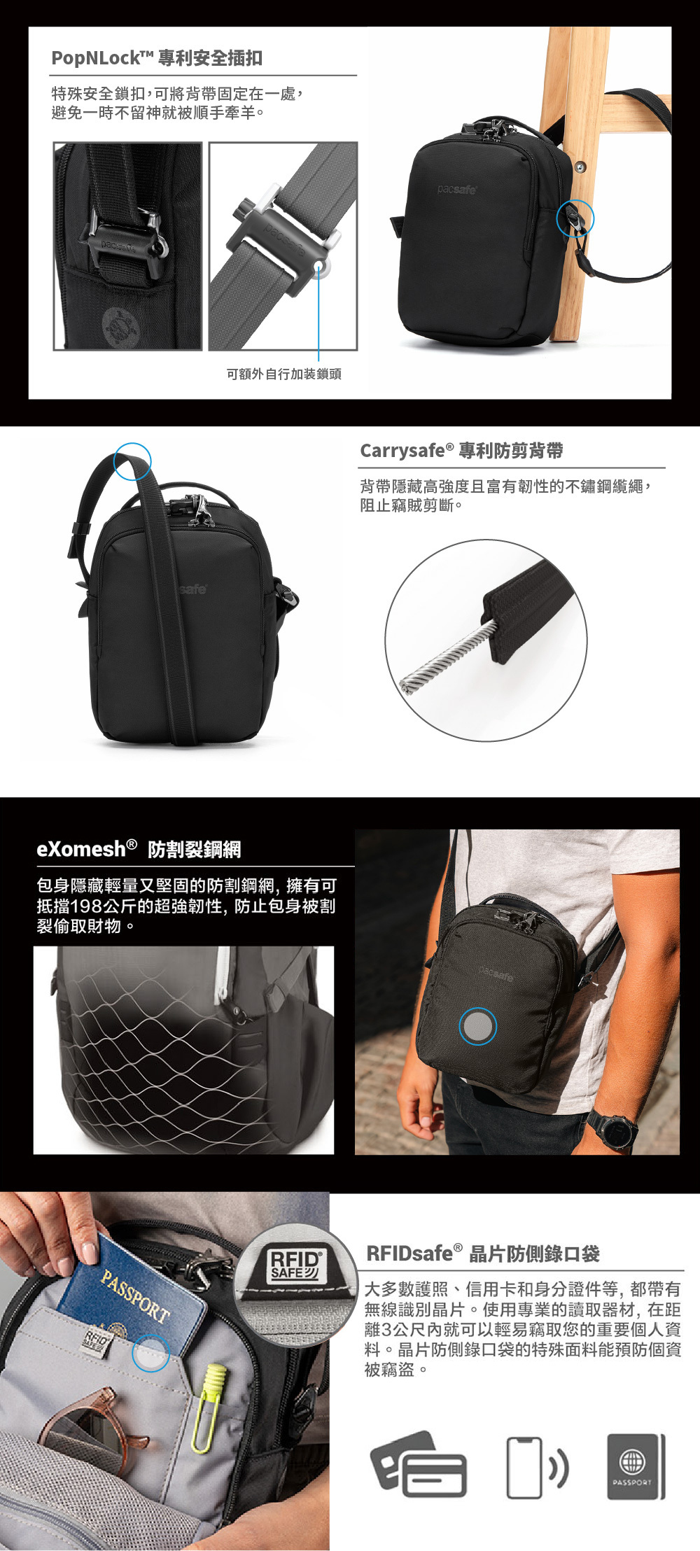 Carrysafe®專利防剪背帶,背帶隱藏不鏽鋼纜繩