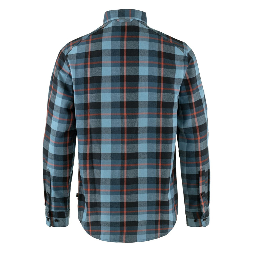 此款鈕釦領之長袖襯衫採用機能材質聚酯棉絨,胸前配置附鈕扣口袋、筆插口袋及拉鍊口袋。