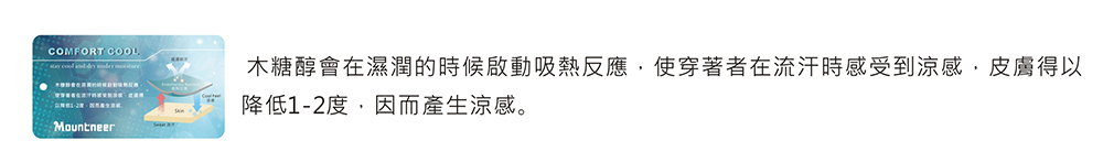 • 木醣醇印花在濕潤時的吸熱反應,使穿著者在流汗時感受到涼感