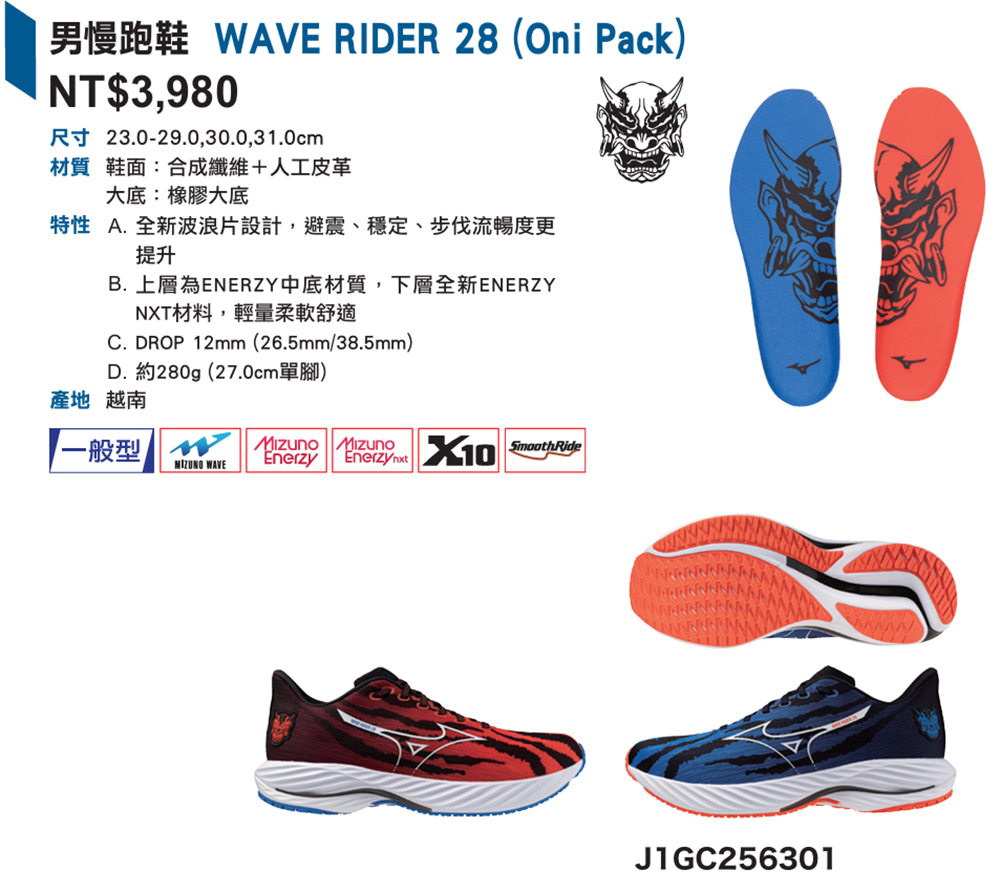 *特惠出清*(男)【美津濃MIZUNO】WAVE RIDER 28 Oni Pack 慢跑鞋-紅色藍色 J1GC256301
